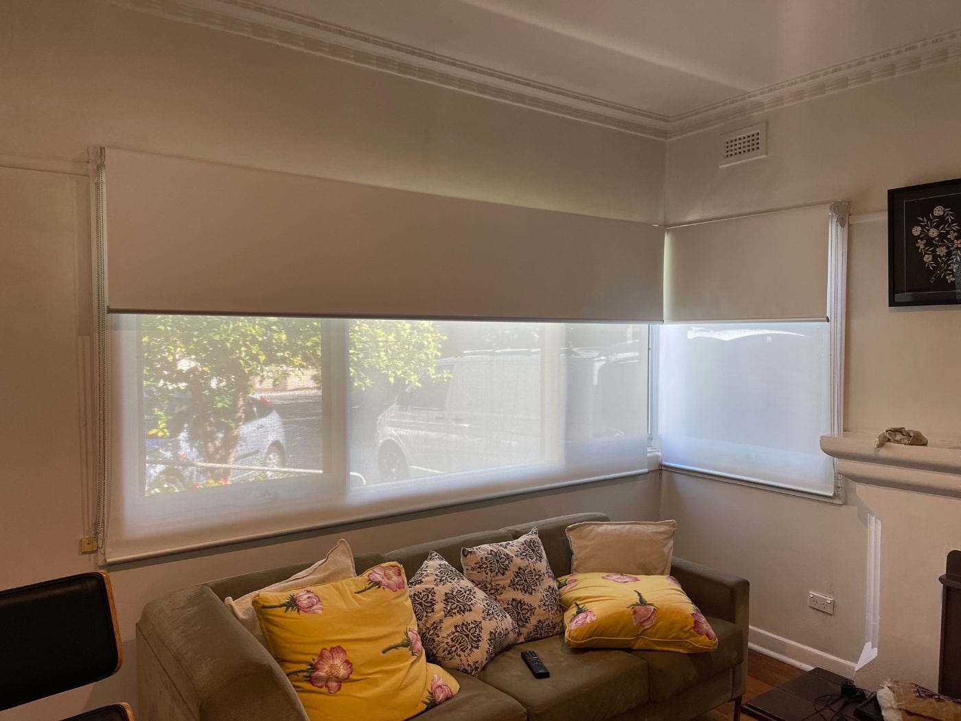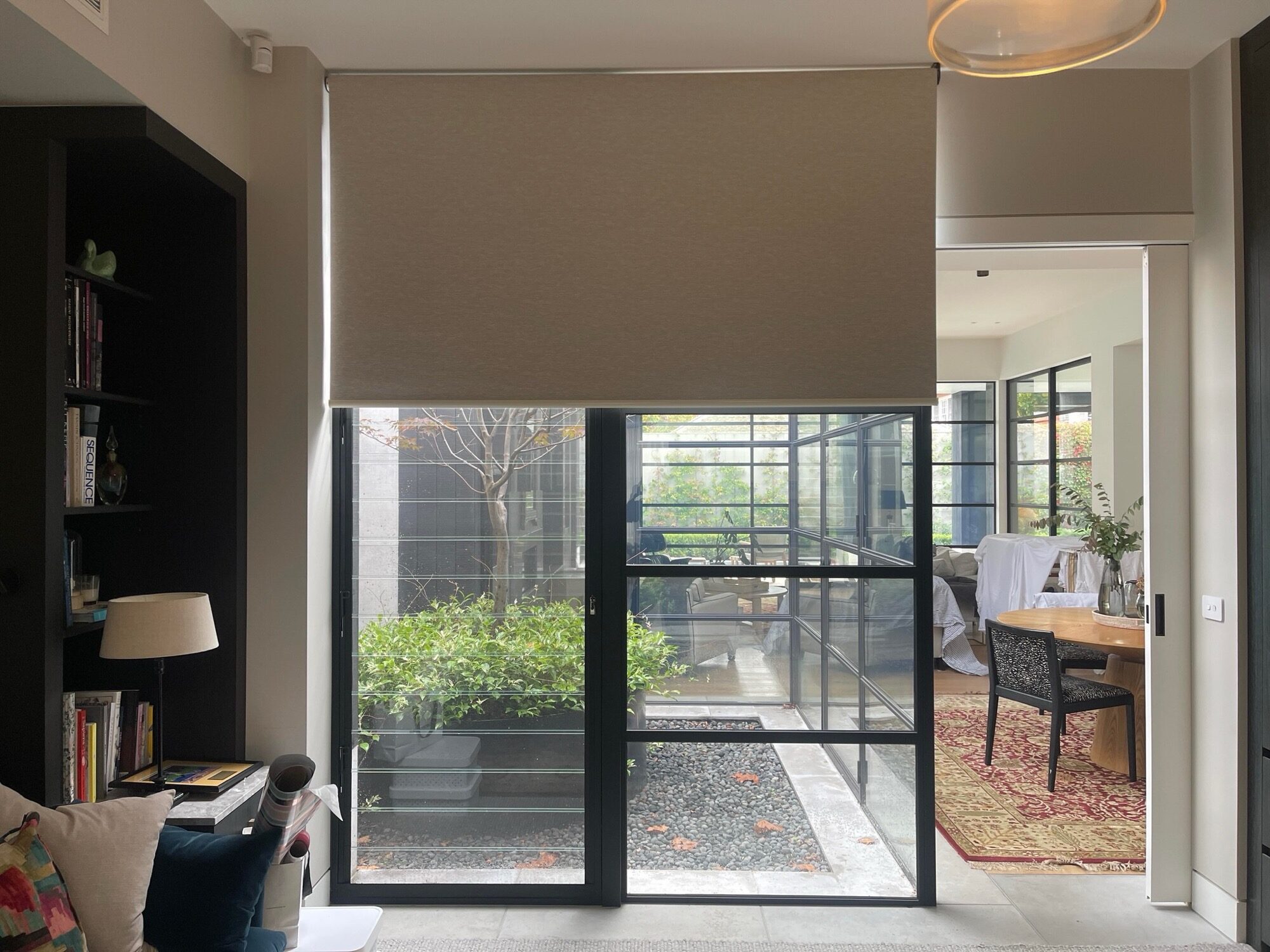 The most popular layered look in Melbourne homes. Roller blinds handle light and privacy, curtains add warmth and texture.